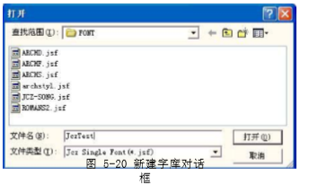 1. 首先点击 jsf 字 库 名 称 按钮 , 并 寻 找EzCad\font 目录,在文件名 的 编 辑 框中 输 入JczTest, 然 后 点 击 打 开 按 图 5-20 新建字库对话 框 钮。如图 5-20 所示。